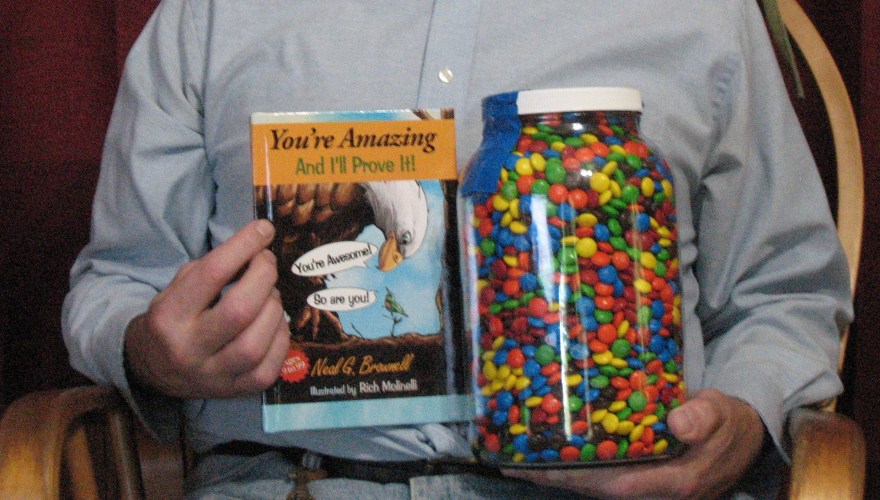 In this photo is me, Neal, holding a gallon jar filled with M&M’s and a hardcover copy of my book which I will autograph for the winner! The contest is easy, just comment below (or on Facebook or reply on Twitter) with your guess of how many M&M’s are in the jar. The person that guesses closest to the amount of M&M’s in the jar will win an autographed hardcover copy ($25 value) of my book, You’re Amazing And I’ll Prove It!